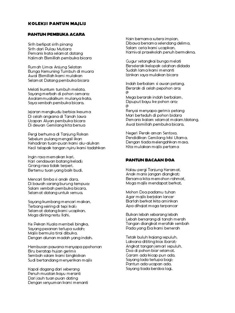 Koleksi Pantun Acara Majlis PANTUN UCAPAN PERASMIAN Daun semulur di pekan sari Batang jerami rebah ke bumi. KOLEKSI PANTUN PENGACARA MAJLIS KOLEKSI PANTUN PENGACARA MAJLIS Sirih berlipat sirih pinang Sirih dari Pulau Mutiara Pemanis kata selamat datang Awal bismillah pembuka bicara Terbang rendah burung tempua Hinggap berdua di dahan ara Hidangan di meja sudah tersedia Dijemput tuan menjamu selera Jejaran mengkudu. Ini beberapa contoh pantun yang aku rekauntuk sesapa yang selalu jadi emcee macam ni - April 12 2010.