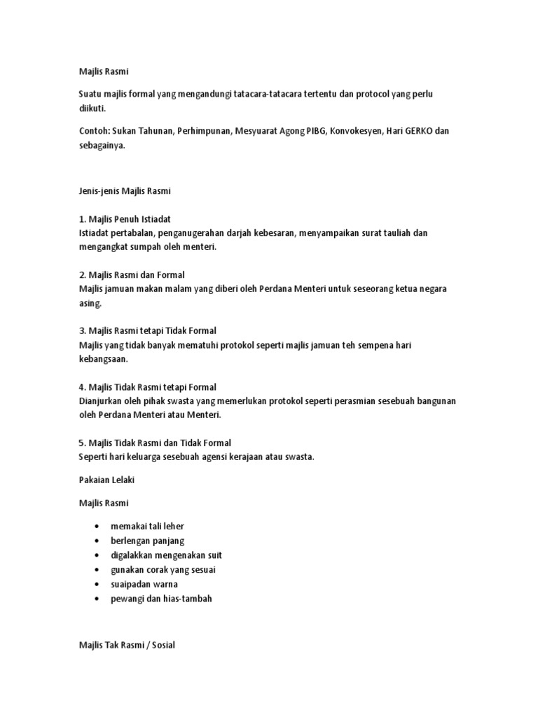 29102016 Majlis rasmi dan formal ialah seperti majlis jamuan makan yang diberikan oleh Perdana Menteri bagi meraikan ketua-ketua kerajaan yang melawat Malaysia perasmian sesuatu majlis anjuran kerajaan sebagai contoh pameran seminar dan sebagainya. MAJLIS PENUH ISTIADAT Istiadat pertabalan penganugerahan darjah kebesaran menyampaikan surat tauliah dan mengangkat sumpah oleh menteri. Pakaian formal juga dipakai ketika menghadiri temu duga ataupun ketika hendak berjumpa dengan golongan berpangkat tinggi seperti Sultan Yang Dipertuan Agong atau Gabenor.